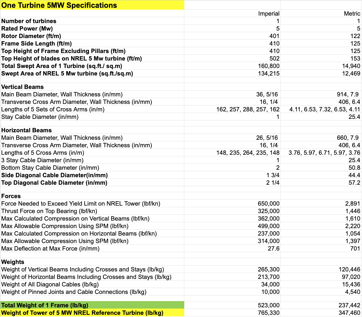 I am providing all the dimensions of the beams, crosses, stays and diagonal cables I used in my analysis. I am also providing the analysis of the frame regarding the loads and forces created by three wind turbine arrangements. There are several reasons why I am doing this. One is to show the rigidity of the frame, and another is to show the weight of the steel needed to build this frame. Perhaps the main purpose is to allow interested parties to do similar calculations to verify the accuracy of the results and to modify calculations where I may have erred. The frame components are not optimized and should only be used for comparison and initial evaluation purposes.